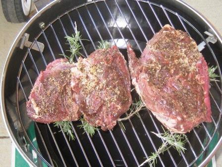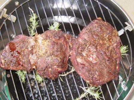 Last week I trimmed an old woody rosemary bush. I saved big pieces of the stalk to use in the smoker. For the lamb I put a few pieces of rosemary wood on the smoking pan and placed some fresh sprigs of rosemary on the rack for the lamb to rest on.
