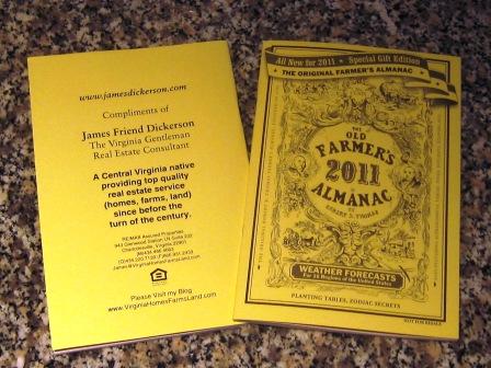The UPS man dropped the 2011 Almanacs off at Camp Karen (our home between Zion Crossroads & Gordonsville, Virginia) yesterday morning. I began passing them out yesterday afternoon to great reviews. Several of you have asked, “Where is my 2011 Almanac?” so if you see me out and about ask again. I usually have a supply of the Virginia Homes Farms and Land Old Farmers Almanacs in the truck to pass out. Have a safe and enjoyable New Years Eve as we make 2011 the best year ever!